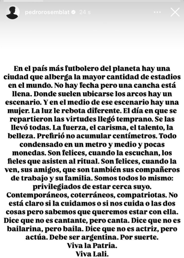 «Dice que no es cantante, pero canta. Dice que no es bailarina, pero baila. Dice que no es actriz, pero actúa. Debe ser argentina. Por suerte. Viva la Patria. Viva Lali”, cerró el influencer.