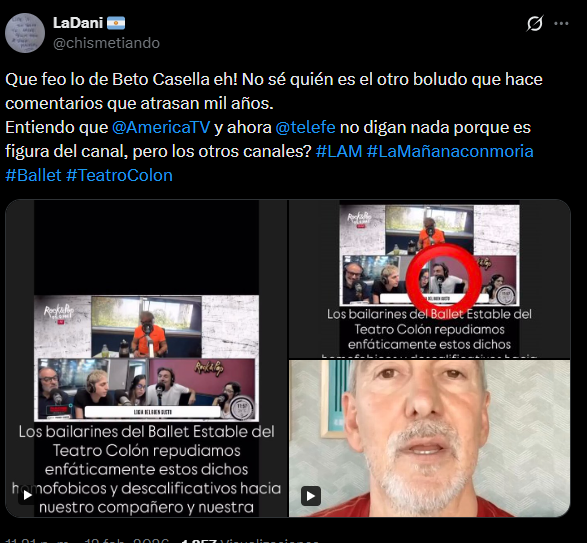 La respuesta no tardó en llegar. Valentín Fresno utilizó sus redes sociales para expresar su malestar: “Pleno 2026 y se siguen escuchando este tipo de comentarios; estoy sin palabras”, escribió. Más adelante agregó: “Es una lástima que medios de comunicación con tanta influencia difundan y avalen comentarios homofóbicos”, y reflexionó sobre el impacto que este tipo de mensajes puede tener en niños y jóvenes que sueñan con dedicarse al ballet: “No normalicemos este tipo de lenguaje y bromas”.