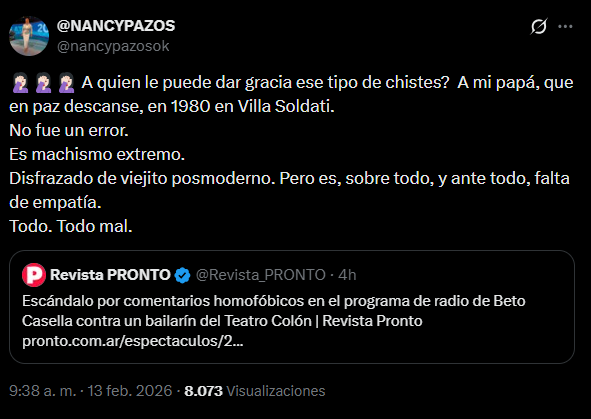 Otra de las voces más contundentes fue la de Nancy Pazos, quien volvió a enfrentarlo públicamente: «A quien le puede dar gracia ese tipo de chistes? A mi papá, que en paz descanse, en 1980 en Villa Soldati. No fue un error. Es machismo extremo. Disfrazado de viejito posmoderno. Pero es, sobre todo, y ante todo, falta de empatía. Todo. Todo mal«, escribió.