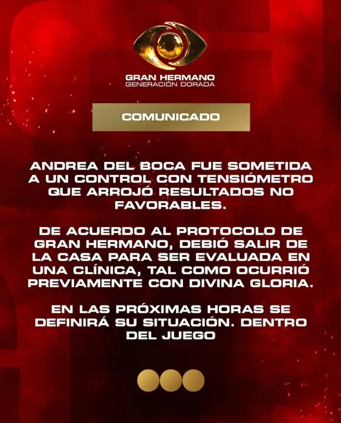 Tras la abrupta salida de la actriz, el programa compartió un comunicado e informó que en las próximas horas se conocerá en detalle si continuará en la casa más famosa del país. “Andrea del Boca fue sometida a un control con tensiómetro que arrojó resultados no favorables”, comienza el escrito.