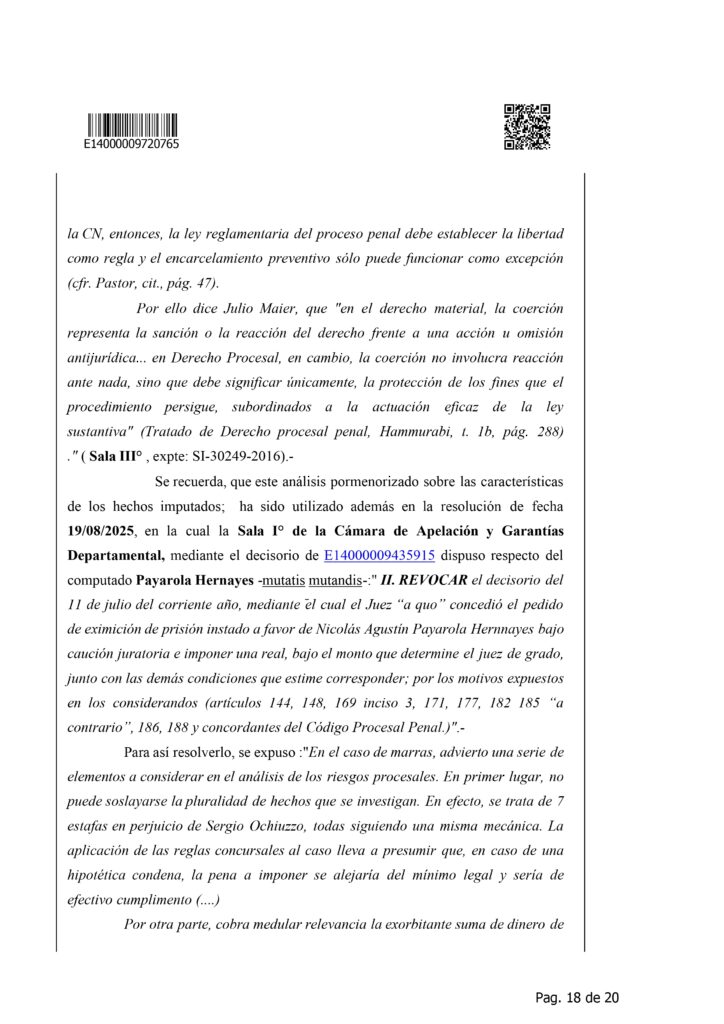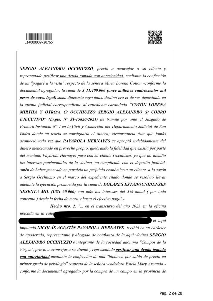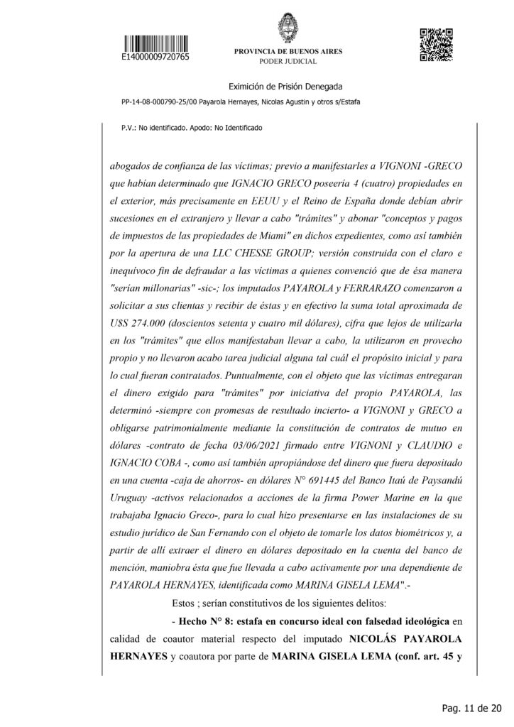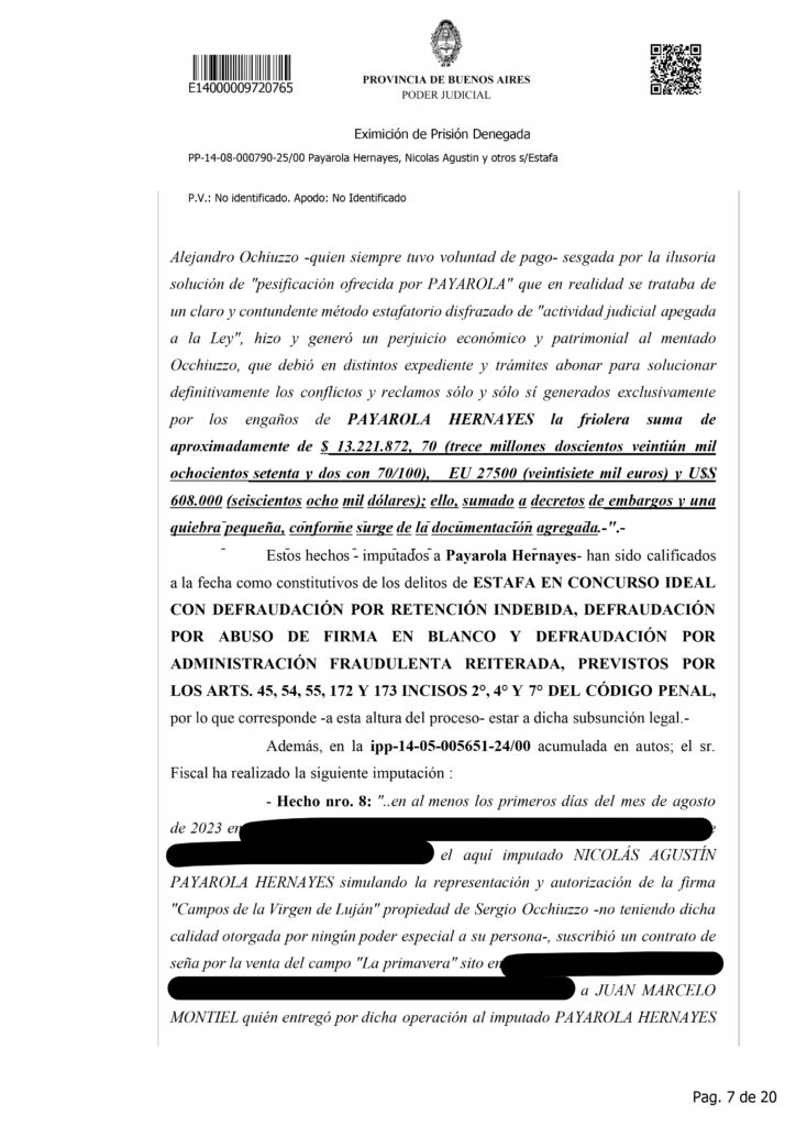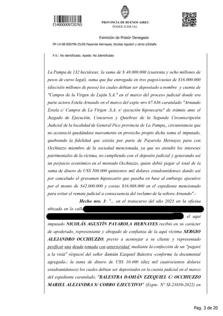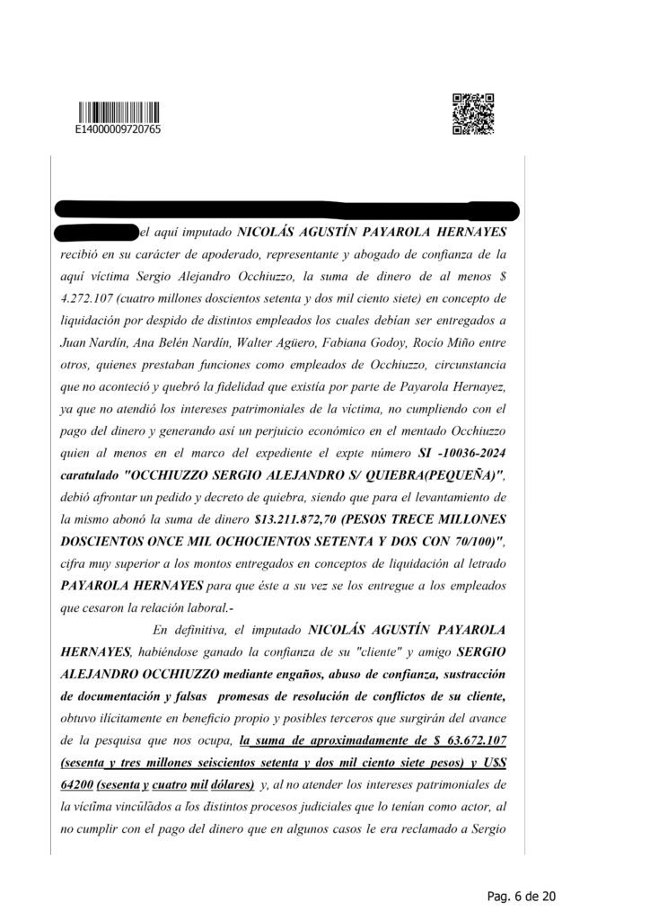 La detención de Nicolás Agustín Payarola Hernayez generó un fuerte impacto judicial y mediático debido a la magnitud de la causa que enfrenta. Según la resolución que denegó su eximición de prisión, el abogado está acusado de encabezar una estructura de estafas y maniobras defraudatorias, desarrolladas durante varios años y que habrían perjudicado a múltiples clientes. La imputación describe once hechos diferentes, todos vinculados al uso abusivo de la confianza profesional, con un perjuicio económico estimado en más de 63 millones de pesos, además de 642 mil dólares y 27.500 euros.