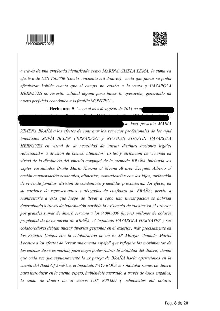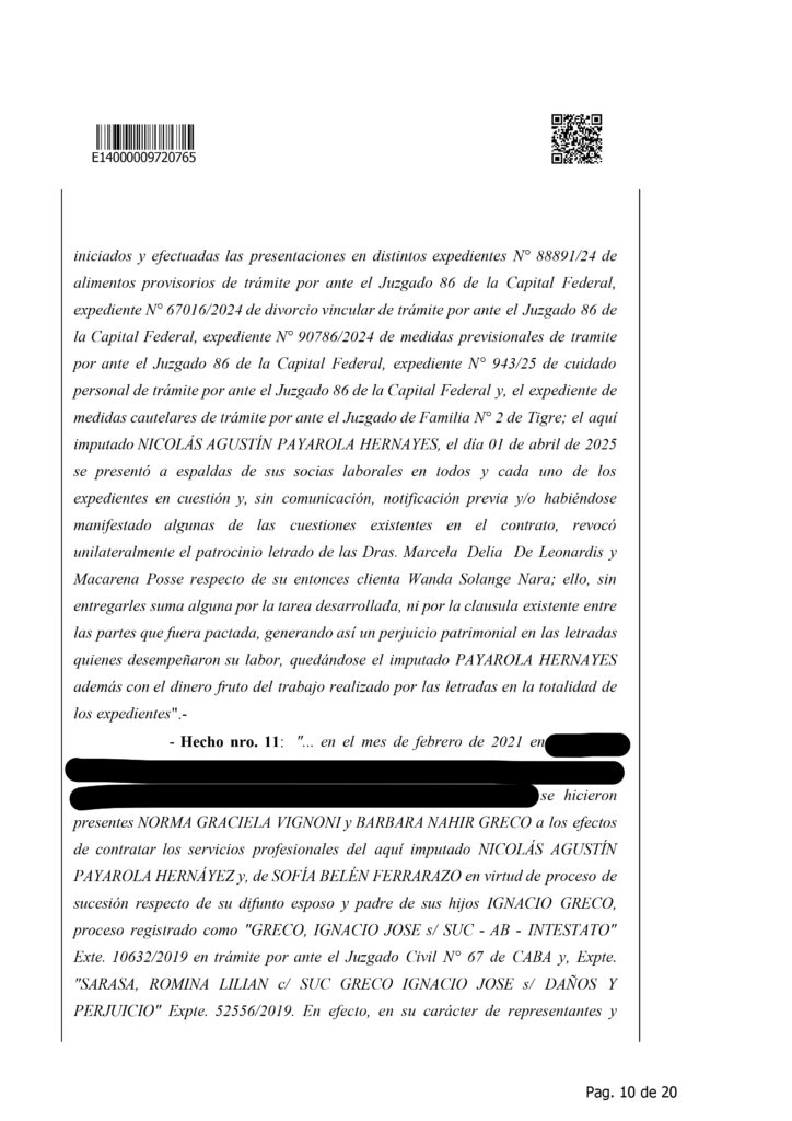 La causa también detalla hechos de mayor gravedad, entre ellos la presunta estafa por 800 mil dólares a María Ximena Braña mediante supuestos trámites internacionales inexistentes, la apropiación de fondos de 274 mil dólares vinculados a una sucesión en el exterior y el caso de la familia del futbolista Gonzalo Montiel, que entregó 700 mil dólares para una inversión inmobiliaria que, según la investigación, nunca se concretó. Además, se incluye un episodio relacionado con Wanda Nara, cuando Payarola contrató a un estudio jurídico a nombre de su clienta, las abogadas trabajaron en el caso y luego él revocó el patrocinio sin pagar los honorarios pactados, quedándose con la retribución obtenida.