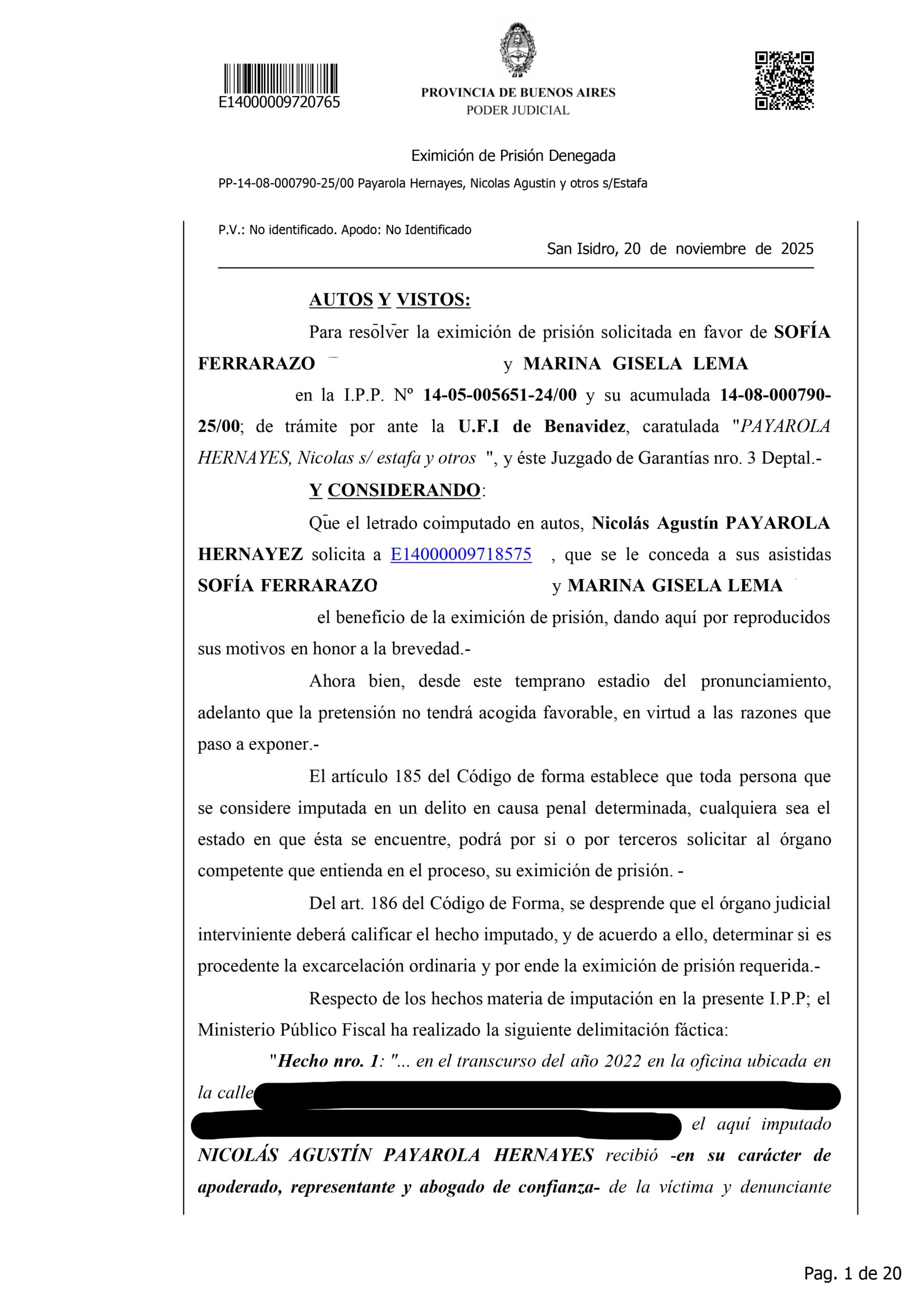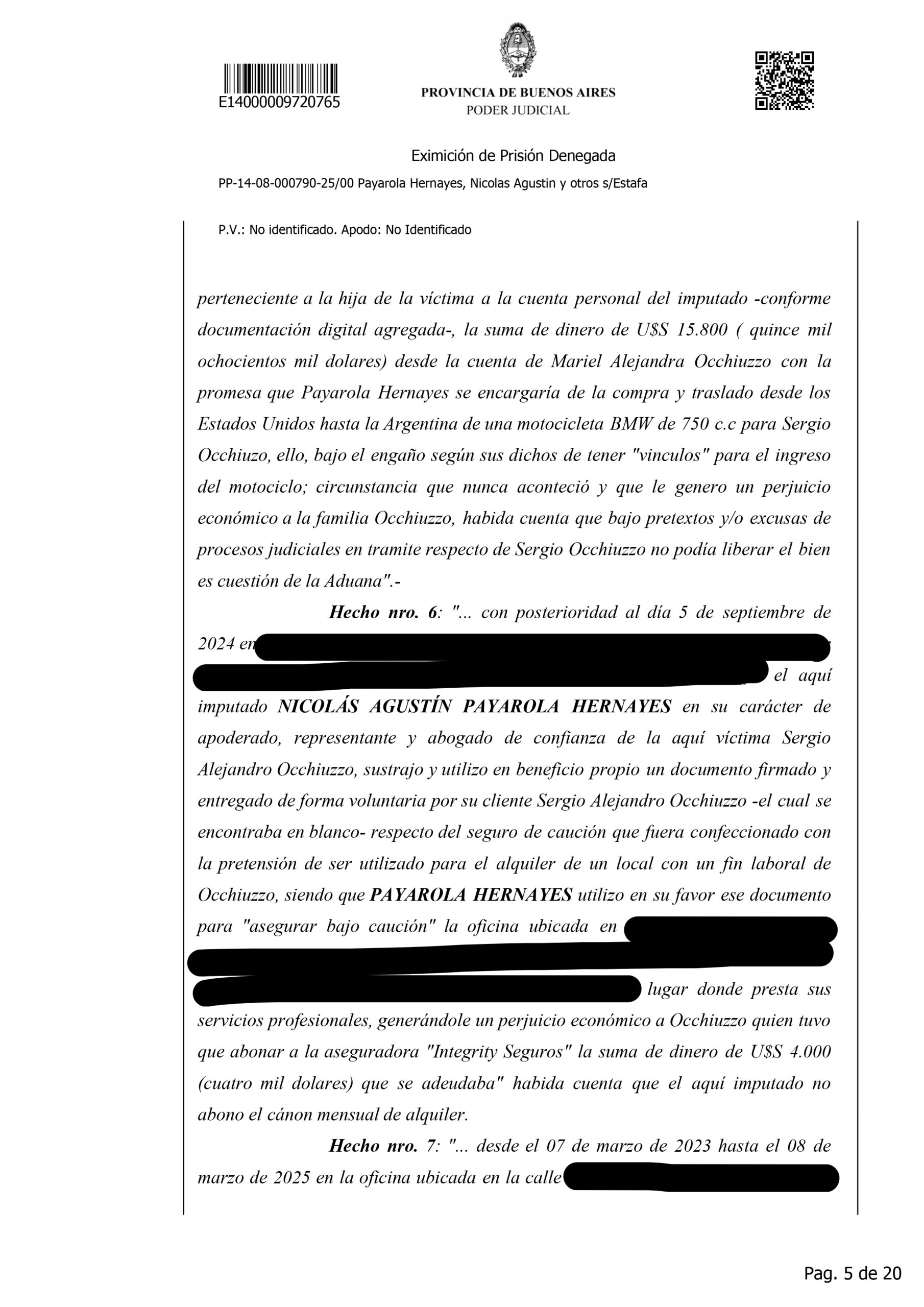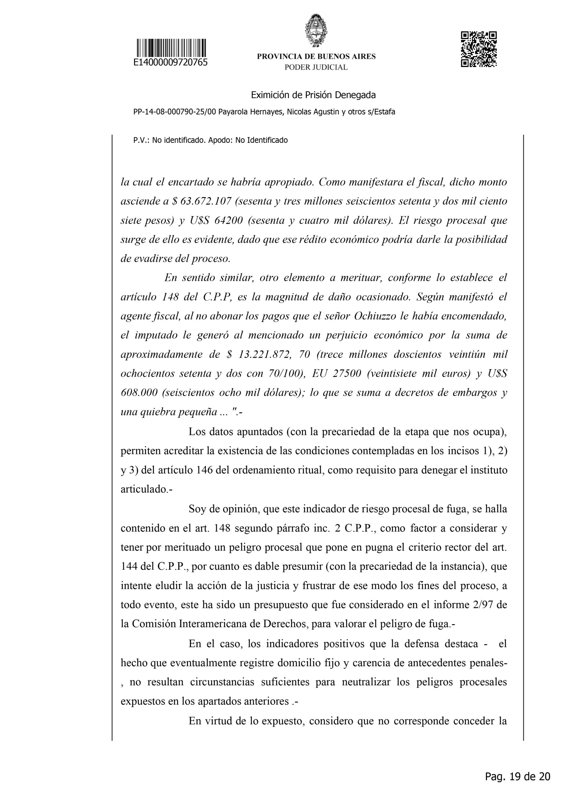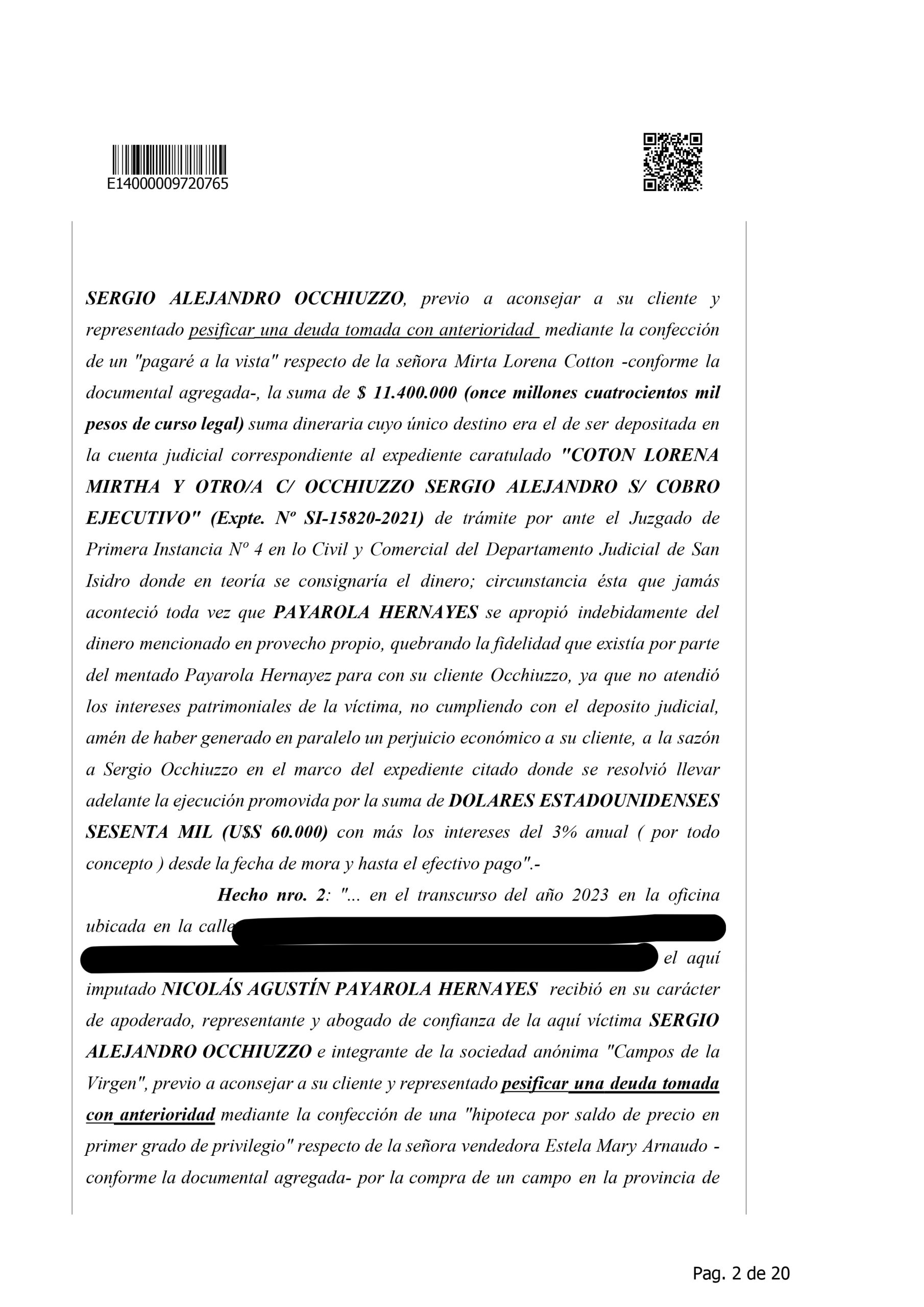 La detención de Nicolás Agustín Payarola Hernayez generó un fuerte impacto judicial y mediático debido a la magnitud de la causa que enfrenta. Según la resolución que denegó su eximición de prisión, el abogado está acusado de encabezar una estructura de estafas y maniobras defraudatorias, desarrolladas durante varios años y que habrían perjudicado a múltiples clientes. La imputación describe once hechos diferentes, todos vinculados al uso abusivo de la confianza profesional, con un perjuicio económico estimado en más de 63 millones de pesos, además de 642 mil dólares y 27.500 euros.