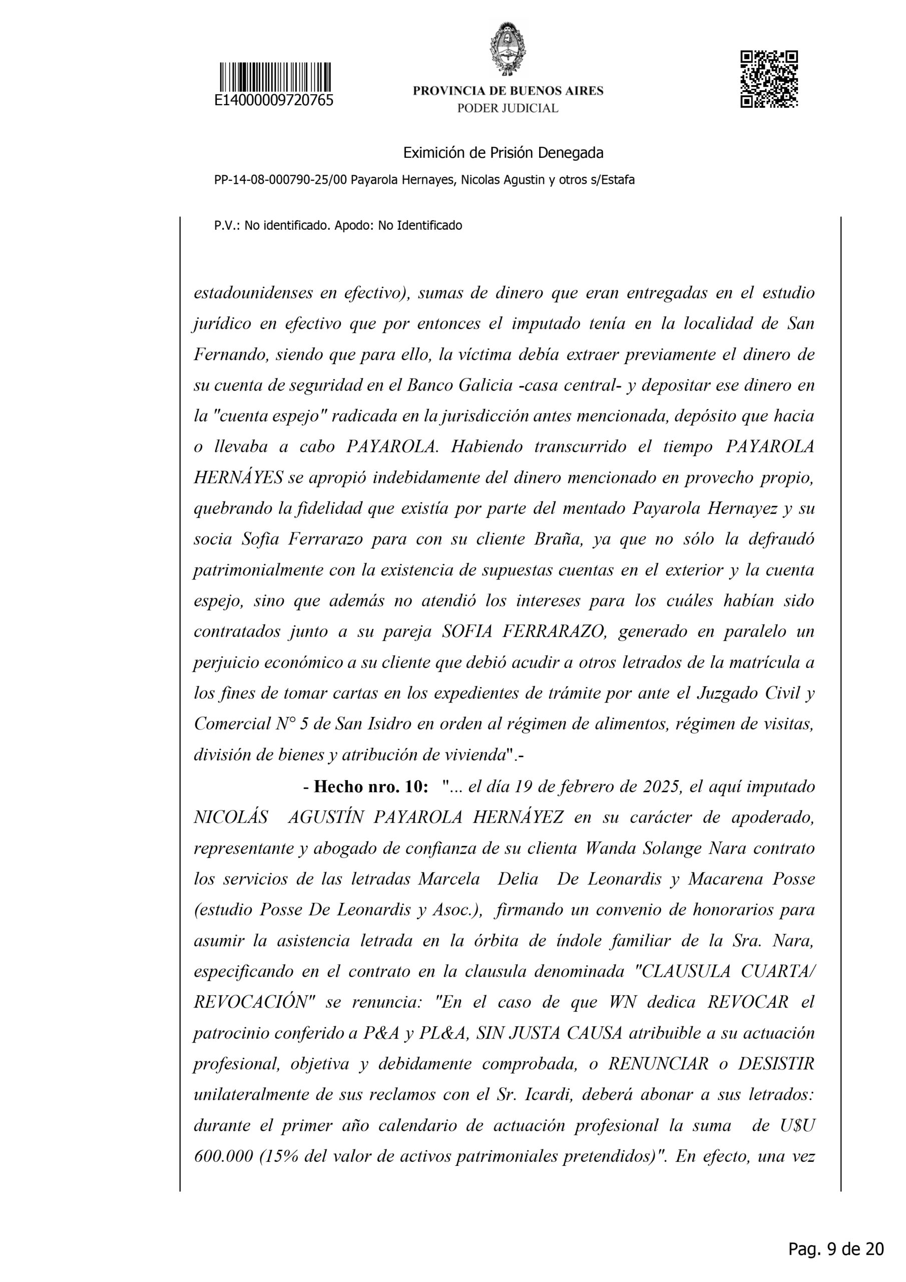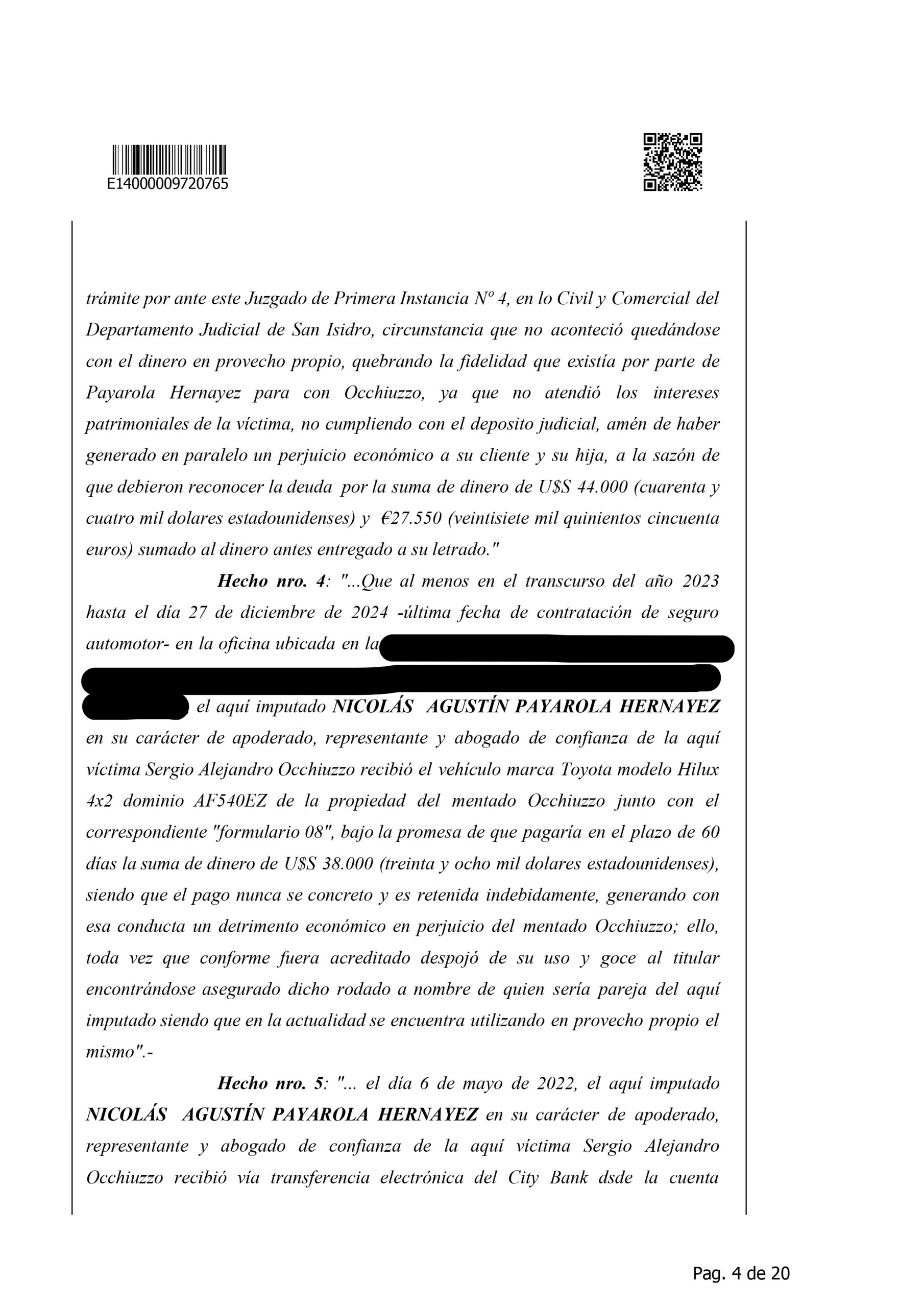 La causa también detalla hechos de mayor gravedad, entre ellos la presunta estafa por 800 mil dólares a María Ximena Braña mediante supuestos trámites internacionales inexistentes, la apropiación de fondos de 274 mil dólares vinculados a una sucesión en el exterior y el caso de la familia del futbolista Gonzalo Montiel, que entregó 700 mil dólares para una inversión inmobiliaria que, según la investigación, nunca se concretó. Además, se incluye un episodio relacionado con Wanda Nara, cuando Payarola contrató a un estudio jurídico a nombre de su clienta, las abogadas trabajaron en el caso y luego él revocó el patrocinio sin pagar los honorarios pactados, quedándose con la retribución obtenida.