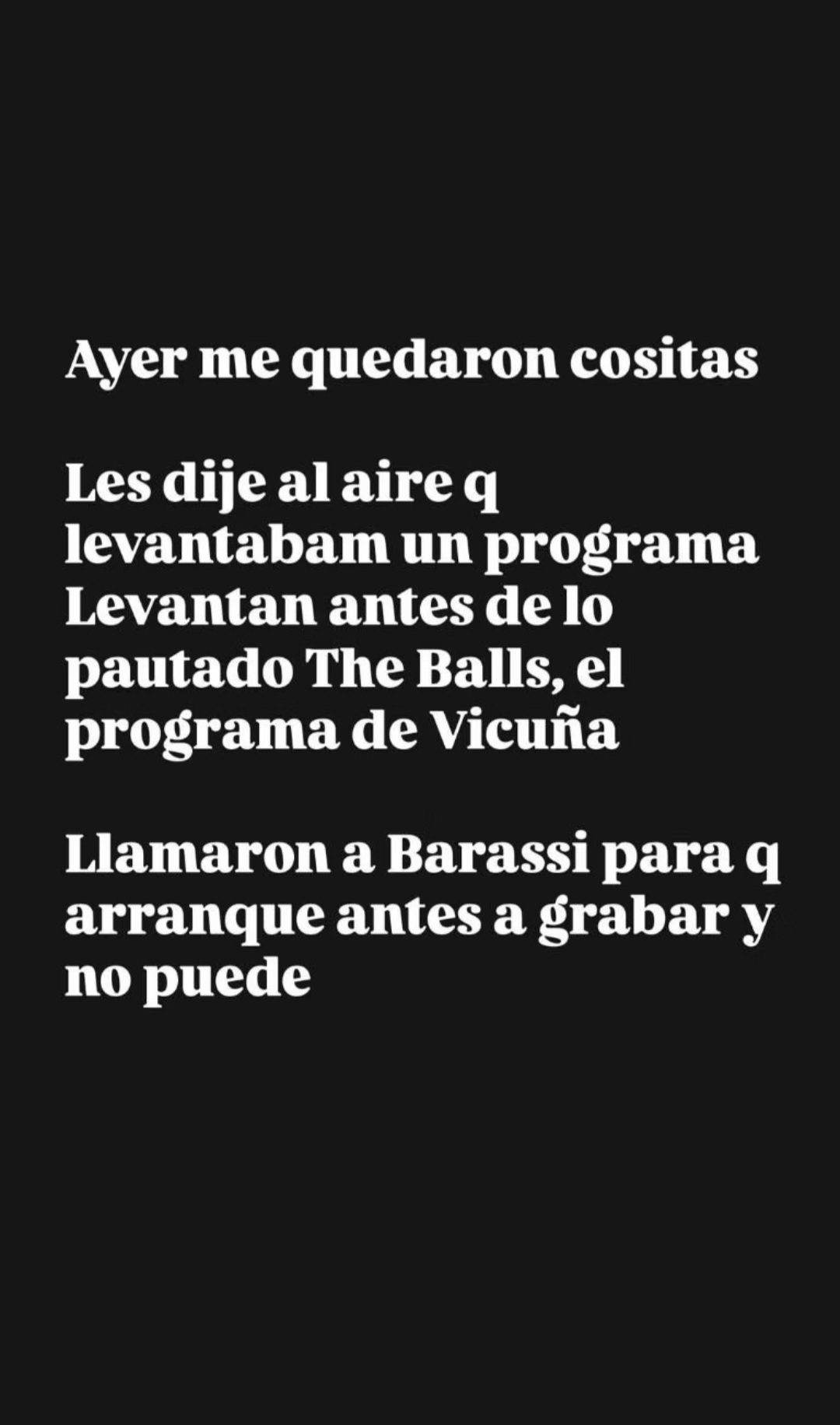 «Les dije al aire que levantaban un programa. Lo levantan antes de lo pautado: The Balls, el programa de Benjamín Vicuña”, aseguró la conductora. Con el fin de reacomodar la grilla semanal, las autoridades del canal habrían intentado que Darío Barassi comience las grabaciones de «Ahora caígo» antes de lo pensado. «Llamaron a Darío Barassi para que arranque antes a grabar, pero no puede», explicó Latorre.