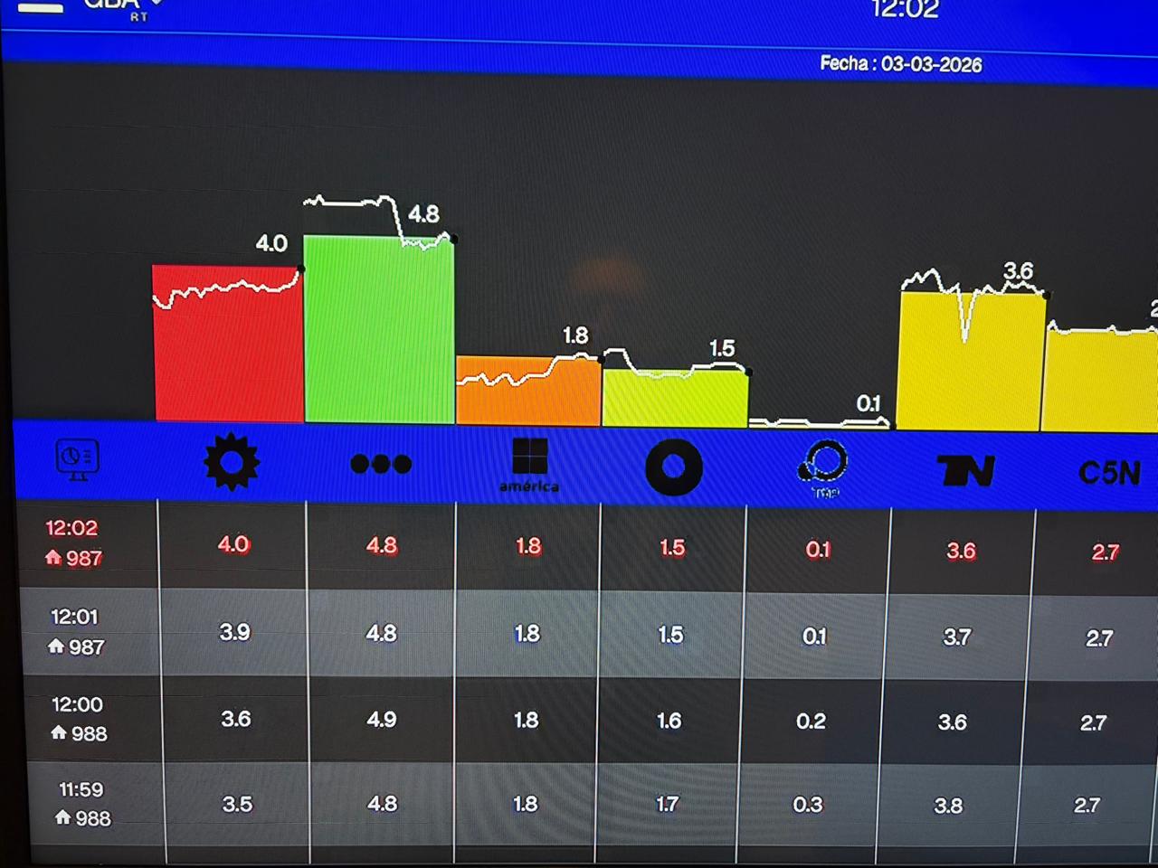 Según el minuto a minuto de este martes, el programa arrancó la franja de las 11:45 con 3.5 puntos y empezó a escalar. A las 11:47 ya marcaba 3.4, pero el verdadero sacudón llegó a las 11:48, cuando trepó a 3.5 y comenzó una curva ascendente que culminó en un pico de 4.0 puntos a las 12:02.