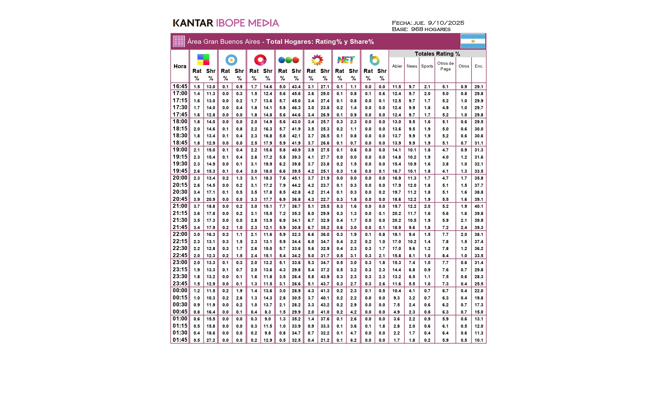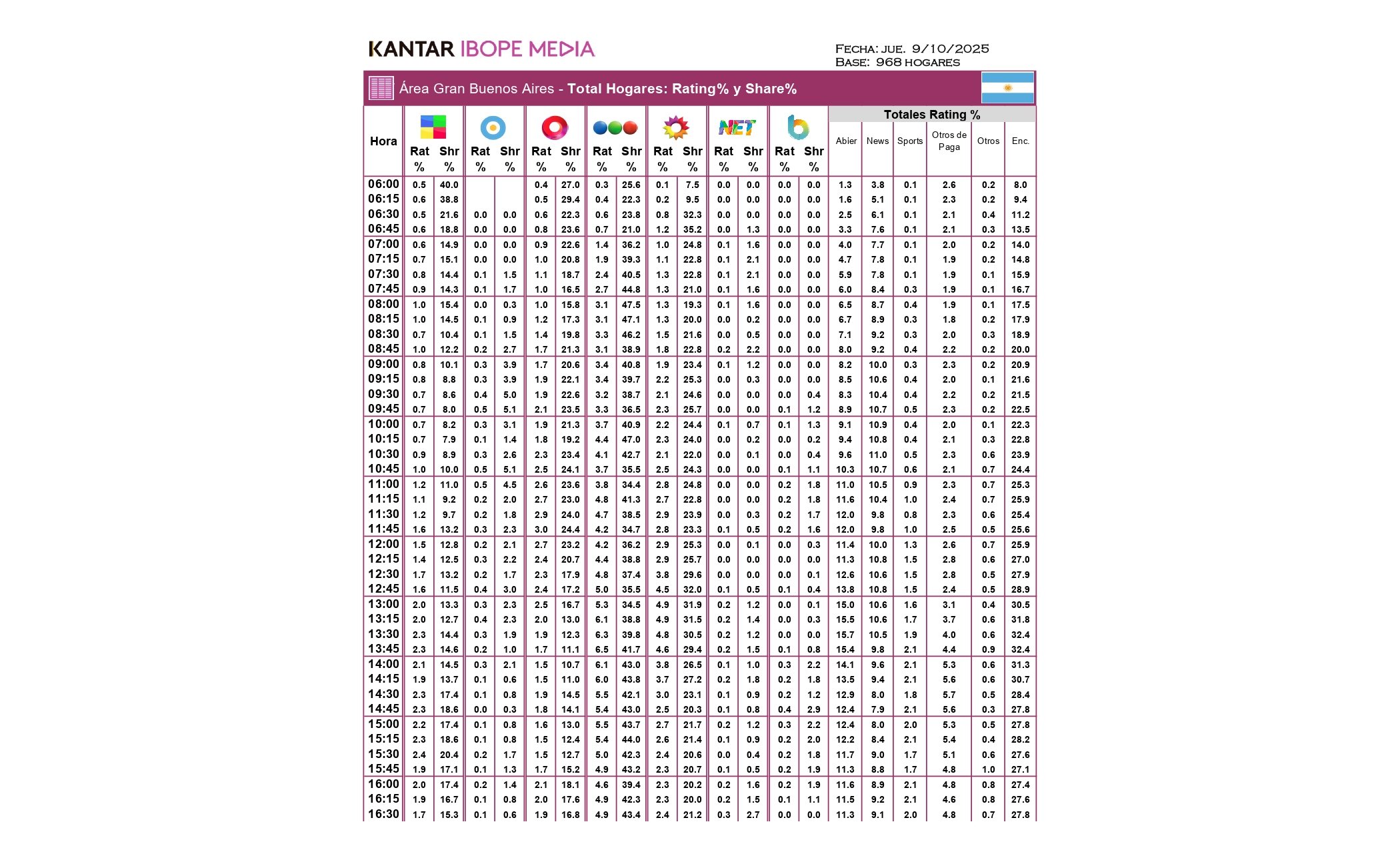 La tendencia victoriosa se mantuvo en el siguiente bloque con la propuesta de Mario Pergolini. Su espacio, «Otro Día Perdido», no solo ratificó el share heredado, sino que amplió la diferencia con cifras contundentes al promediar 5.2 puntos. El ciclo de entrevistas y debates no dio tregua, aplastando al concurso de preguntas y respuestas de la señal de las tres pelotas, «Pasapalabra», que registró un discreto 3.2 puntos en la misma franja. La combinación de la popularidad de Kaczka y el estilo disruptivo de Pergolini resultó ser una fórmula ganadora para atraer y retener al público.