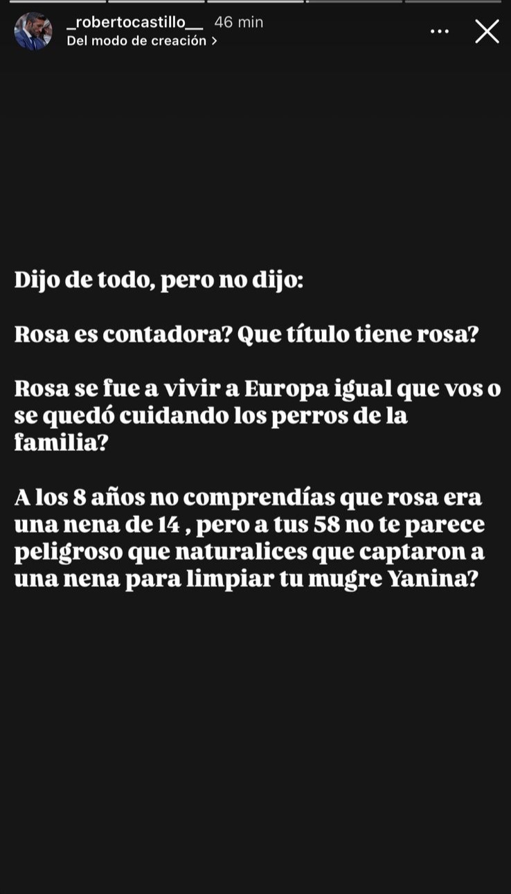 Luego de esos comentarios despectivos, Roberto Castillo no se quedó callado y en su cuenta de Instagram apuntó contra la esposa de Diego Latorre y la arrobó. Además, la trató de explotadora infantil por el vínculo con Rosa, su «niñera» desde que la mujer tenía tan solo 14 años.