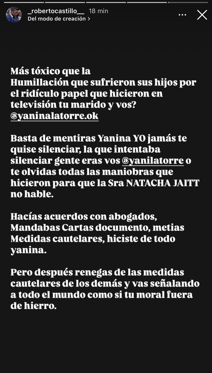 La guerra entre Yanina Latorre y Roberto Castillo suma un nuevo capítulo. Después de que el abogado iniciara acciones legales contra la conductora, el novio de Cinthia Fernández volvió a apuntar contra la angelita.
