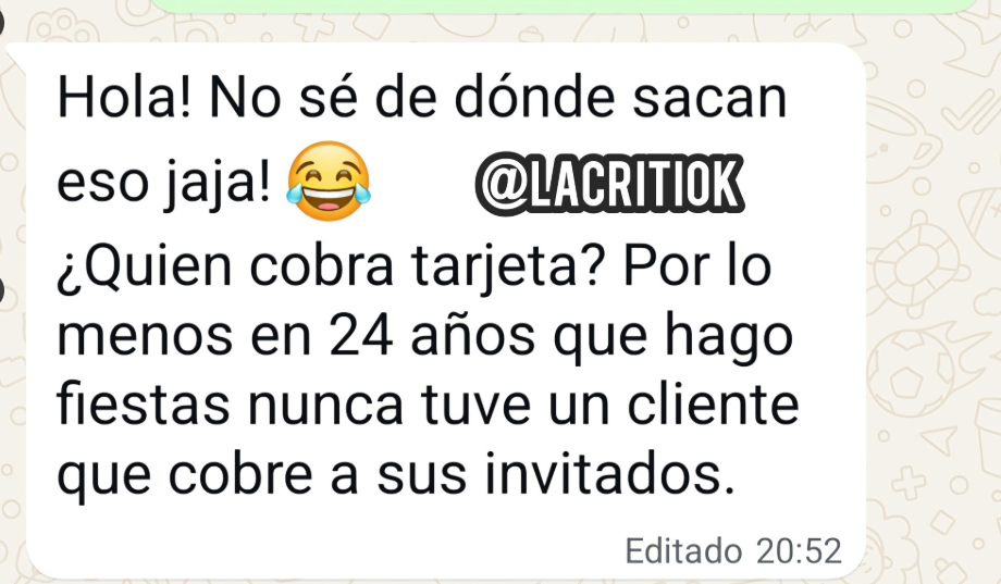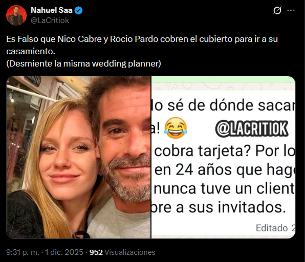 A días del casamiento más comentado del año, Rocío Pardo decidió enfrentar de lleno una versión que llevaba meses circulando: el supuesto cobro de tarjeta a los invitados. La actriz puso fin a la polémica enviándole un mensaje directo a Pilar Smith, panelista de LAM, donde dejó las cosas claras. «Hola Pili, es mentira», escribió, anulando cualquier especulación. Su aclaración se sumó a la voz profesional de la wedding planner del evento, quien reforzó la desmentida con una frase contundente: «¡No sé de dónde sacan eso! ¿Quién cobra tarjeta? Por lo menos en 24 años que hago fiestas nunca tuve un cliente que cobre a sus invitados».