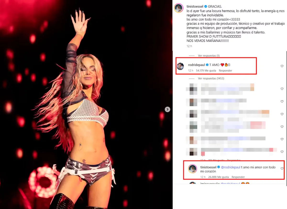 “Gracias. Lo de ayer fue una locura hermosa, lo disfruté tanto, la energía que nos regalaron fue inolvidable. Lxs amo con todo mi corazón”, escribió la intérprete de Carne y hueso. Luego añadió: “Gracias a mi equipo de producción, técnico y creativo por el trabajo inmenso que hicieron, por confiar y acompañarme. Gracias a mis bailarines y músicos tan llenos de talento”. Sin embargo, el detalle que se robó todas las miradas fue el romántico comentario de Rodrigo de Paul, quien no dudó en escribirle: “Te amo”, acompañado de emojis de corazones y fueguitos.