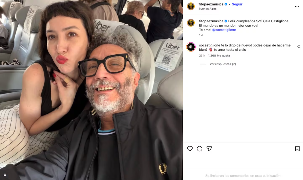 El origen de las especulaciones se intensificó tras un posteo de Fito Páez en redes sociales, donde felicitaba a Sofía por su cumpleaños y expresaba públicamente su cariño: “Feliz cumpleaños Sofía Gala Castiglione, el mundo es un mundo mejor con vos, te amo!”. La actriz respondió de manera cálida: “Te lo digo de nuevo, podés dejar de hacerme bien? Te amo hasta el cielo”, confirmando la cercanía emocional entre ambos y dejando entrever la profundidad de su vínculo.