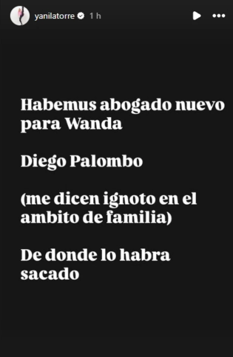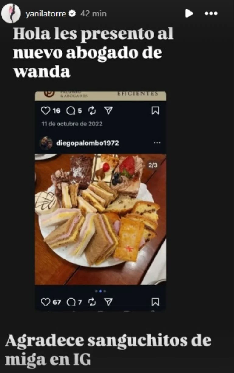 “Habemus abogado nuevo para Wanda: Diego Palombo. Me dicen ignoto en el ámbito de familia. ¿De dónde lo habrá sacado?”, escribió la panelista en su primer posteo, dando inicio a una catarata de comentarios que no pasaron desapercibidos. Luego, Yanina publicó una captura del Instagram del letrado con una frase que desató risas: “Hola, les presento al nuevo abogado de Wanda. Agradece sanguchitos de miga en Instagram”, acompañando el texto con una imagen de Palombo agradeciendo un catering.