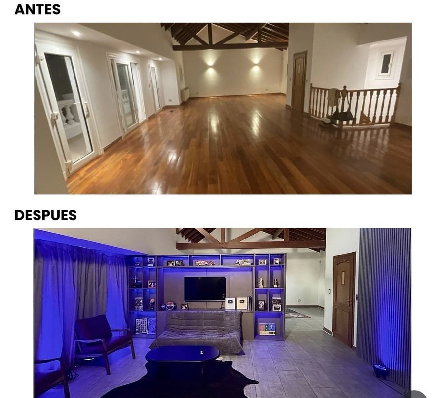 En las redes sociales compartieron el antes y después del estudio que resaltaba el blanco. Con el cambio que realizaron el color que predomina es el azul marino. Además agregaron un sillón, una mesa ratona, un televisor y una alfombra.