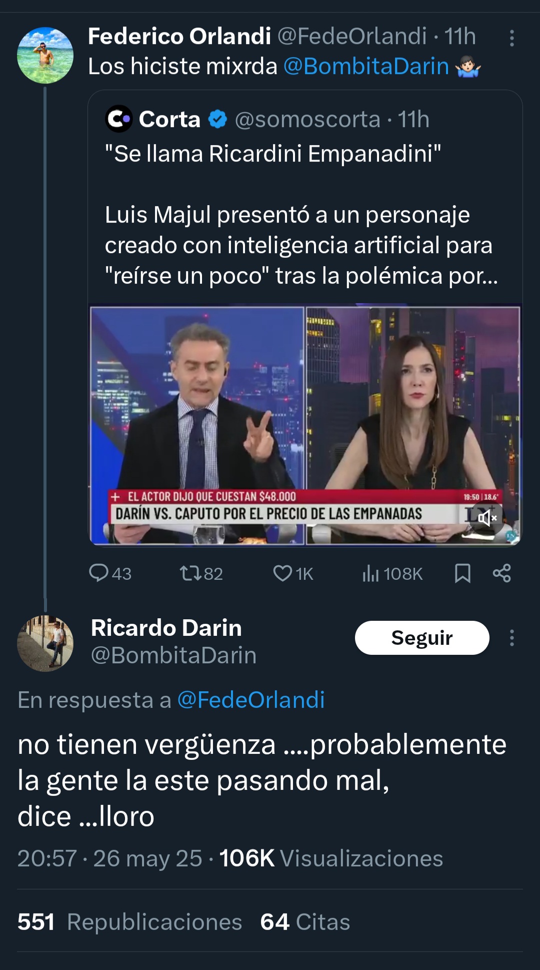 Acto seguido presentó una particular caricatura llamada «Ricardini Empanadini» creada con «Tralalero tralala», una inteligencia artificial furor en Italia. La imagen mostraba la cara de Darín lo cual generó indignación y le respondió en su cuenta de X. «No tienen vergüenza… probablemente la gente la esté pasando mal, dice», respondió indignado.