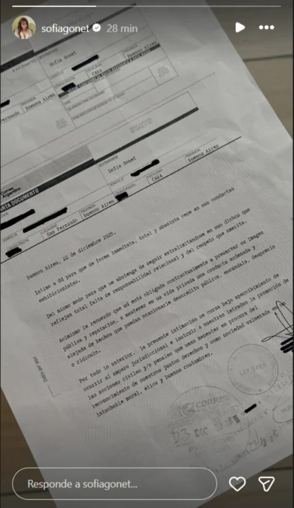 «La carta documento data del 22 de diciembre de 2025 y el texto es contundente. “Intimo a Ud para que de forma inmediata, total y absoluta cese en sus conductas exhibicionistas. Del mismo modo para que se abstenga de seguir extralimitándose en sus dichos que reflejan total falta de responsabilidad relacional y del respeto que amerita”.