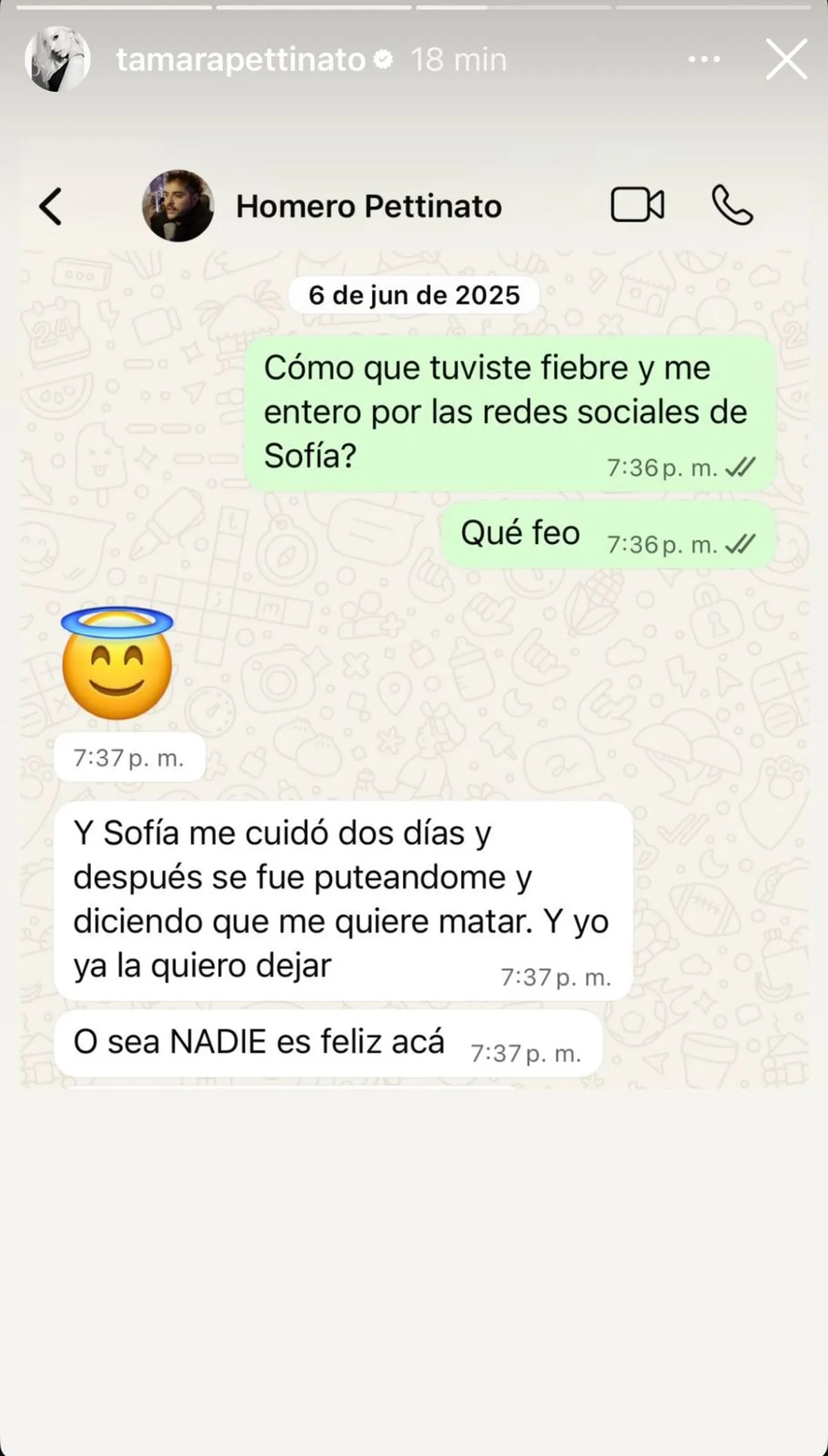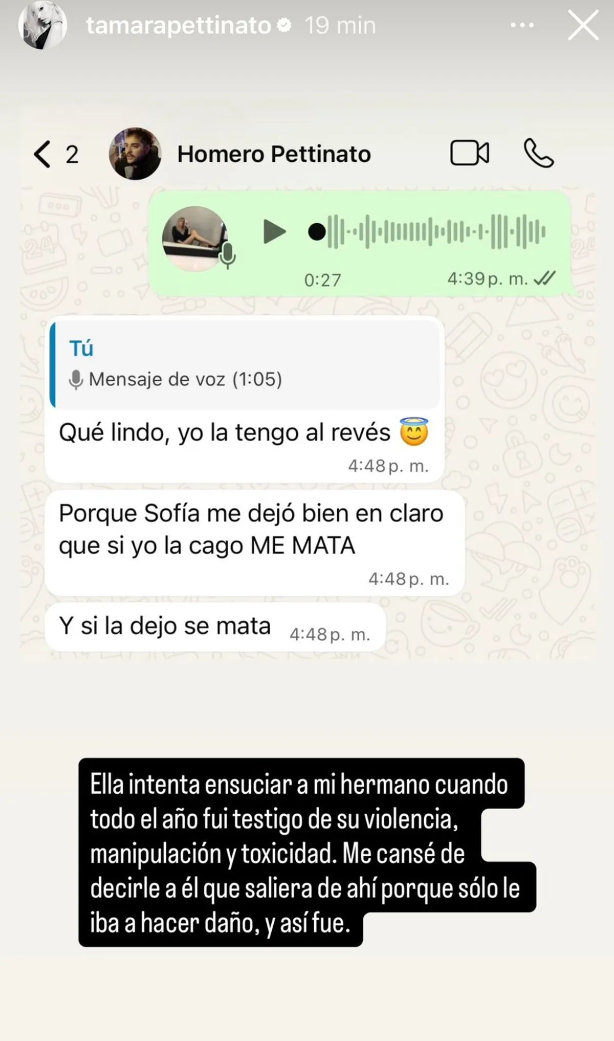 A través de sus historias de Instagram, Tamara compartió capturas de conversaciones con Homero para sostener su postura. En uno de los mensajes, el humorista le confesaba: «Sofía me dejó bien en claro que si yo la cago me mata, y si la dejo, se mata». Junto a esa imagen, Tamara fue contundente: «Ella intenta ensuciar a mi hermano cuando todo el año fui testigo de su violencia, manipulación y toxicidad. Me cansé de decirle a él que saliera de ahí porque solo le iba a hacer daño, y así fue».