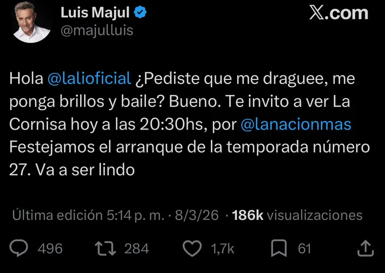 Horas más tarde, el conductor reforzó el mensaje a través de su cuenta de X (ex Twitter). “Hola @lalioficial ¿Pediste que me draguee, me ponga brillos y baile? Bueno. Te invito a ver La Cornisa hoy a las 20:30 por La Nación+”, escribió. Además, explicó que se trataba de una emisión especial por el arranque de la temporada número 27 del ciclo.