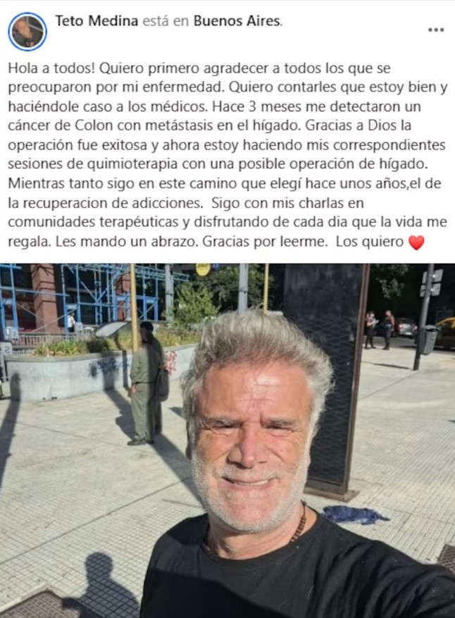 Marcelo «Teto» Medina comunicó que tiene cáncer de colón con  metástasis en el hígado. El conductor utilizó su cuenta de Facebook y dio a conocer el diagnóstico que recibió hace tres meses. Con palabras claras, agradeció las muestras de afecto y agradecimiento.