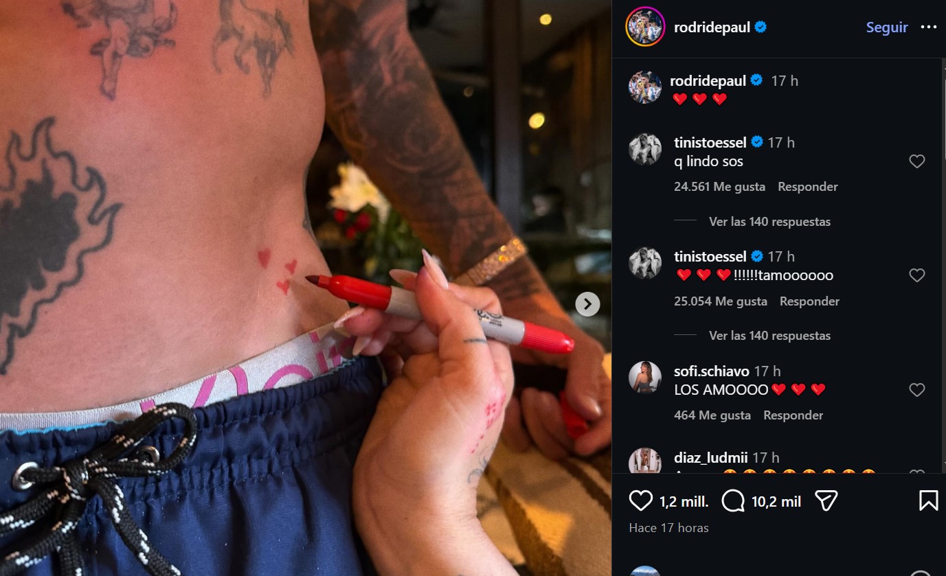 La primer imagen que decidió compartir el futbolista de la Selección Argentina fue la mano de la artista dibujándole tres corazones, diseño que posteriormente el mediocampista decidió tatuárselo. El gesto fue  leído como una demostración de amor y de compromiso, pero los internautas no dudaron en remarcar que Tini decidió dibujar tres corazones, dando por sentado que podrían estar en la dulce espera.