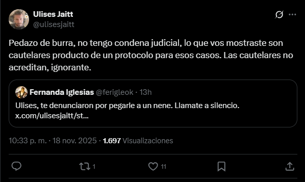 La respuesta de Iglesias no tardó en llegar y elevó más la tensión: “Ulises, te denunciaron por pegarle a un nene. Llamate a silencio”. Frente a esto, Jaitt redobló la apuesta diciendo: “Pedazo de burra, no tengo condena judicial, lo que vos mostraste son cautelares producto de un protocolo para esos casos. Las cautelares no acreditan, ignorante”.