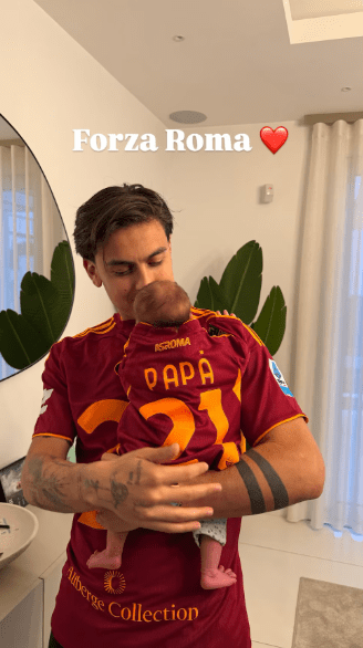 El futbolista también eligió mostrar su lado más apasionado publicando una instantánea donde sostiene a Gia, ambos luciendo la camiseta oficial de la Roma. La indumentaria de la bebé lleva estampado el nombre “Papá” y el número 21, su dorsal característico.