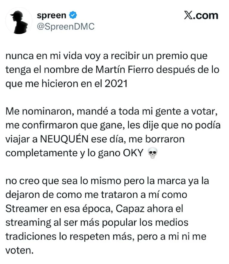El streamer expresó su enojo a través de su cuenta de X (ex Twitter), donde recordó una experiencia negativa con la organización. “Nunca en mi vida voy a recibir un premio que tenga el nombre de Martín Fierro, después de lo que me hicieron en el 2021”, escribió. Según relató, en aquella edición de los Martín Fierro Digital le confirmaron que había ganado, pero tras avisar que no podría viajar a Neuquén, lo eliminaron de la lista de ganadores. “Me nominaron, mandé a toda mi gente a votar, me confirmaron que gané… y lo terminó ganando Oky”, explicó indignado.