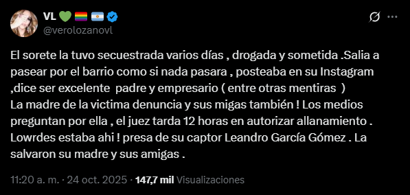 Vero también apuntó contra la ineficiencia judicial, señalando que el juez tardó más de 12 horas en aprobar el operativo: “La madre de la víctima denuncia y sus amigas también. El juez tarda 12 horas en autorizar el allanamiento. ¡Lourdes estaba ahí! Presa de su captor Leandro García Gómez. La salvaron su madre y sus amigas”, sentenció. Su publicación rápidamente se viralizó, generando un fuerte debate en redes sobre la lentitud del sistema judicial frente a casos de violencia de género.
