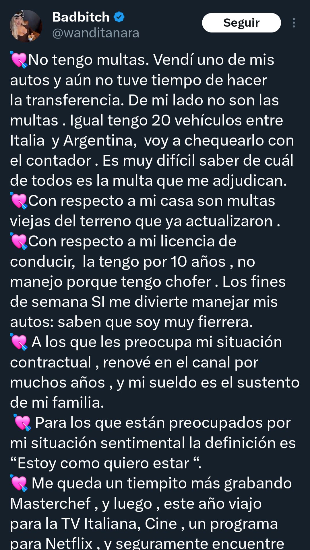 «No tengo multas. Vendí uno de mis autos y aún no tuve tiempo de hacer la transferencia. De mi lado no son las multas. Igual tengo 20 vehículos entre Italia y Argentina, voy a chequearlo con el contador. Es muy difícil saber de cuál de todos es la multa que me adjudican», comenzó escribiendo la mediática.