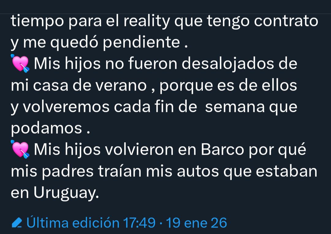 «Mis hijos no fueron desalojados de mi casa de verano, porque es de ellos y volveremos cada fin de semana que podamos. Mis hijos volvieron en Barco porque mis padres traían mis autos que estaban en Uruguay», finaliza el comunicado.