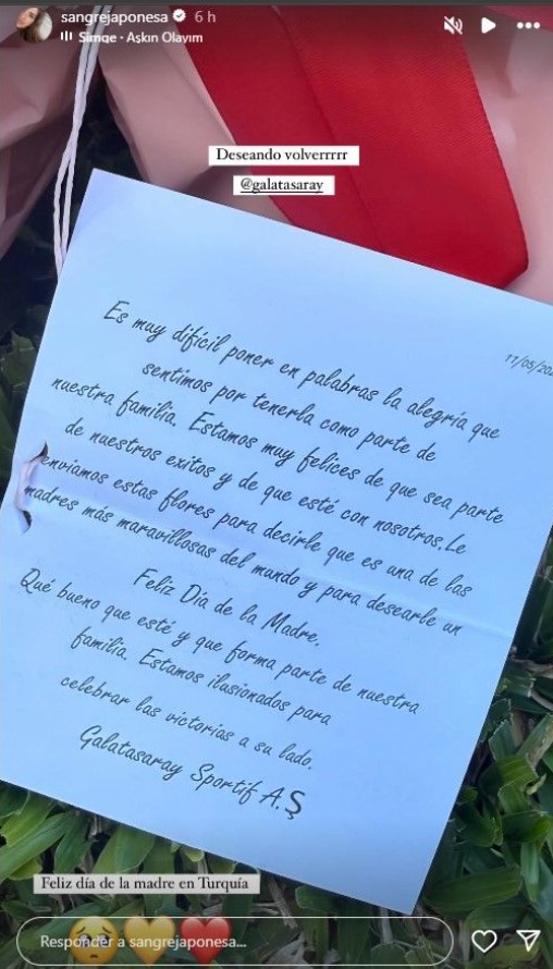 Horas más tarde, Wanda Nara compartió en una story, mostrando el supuesto obsequio que le había enviado el equipo turco. » “Feliz día a nuestra Leona. Sabemos el esfuerzo que has hecho por este club. Eres una gran madre y tus cinco hijos estarán orgullosos de ti. Te extrañamos en cada partido por la suerte que siempre nos has traído. Felicidades hoy y siempre. Nunca nadie hará olvidar lo que has hecho por estos colores. Sos bienvenida siempre, Galatasaray”, la carta estaba acompañada por rosas blancas.