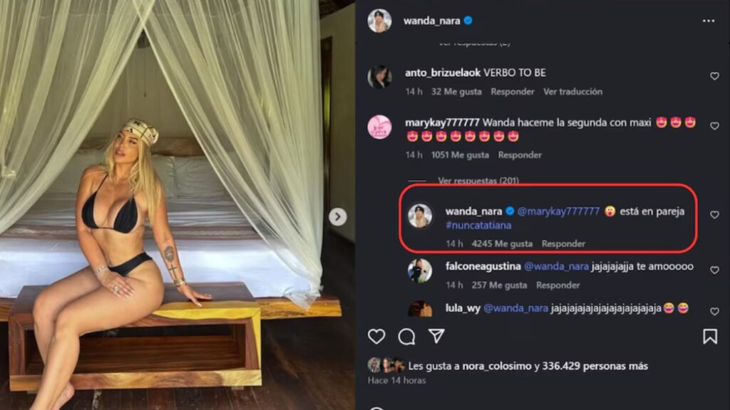 En el posteo, dedicado a mostrar algunos de los modelos de su línea de trajes de baño que saldrá en las próximas semanas, una usuaria decidió pedirle un favor sentimental en lugar de halagar el producto: “Wanda haceme la segunda con Maxi”, escribió, sin etiquetarla. La respuesta de Nara fue tan breve como contundente: “Está en pareja. #NuncaTatiana”. El hashtag elegido no pasó inadvertido: “Tatiana” es el apodo con el que redes y el streamer Martín Cirio bautizaron a Suárez tras el escándalo de 2021, cuando Wanda la acusó de haberse involucrado con Icardi mientras él aún estaba en pareja.