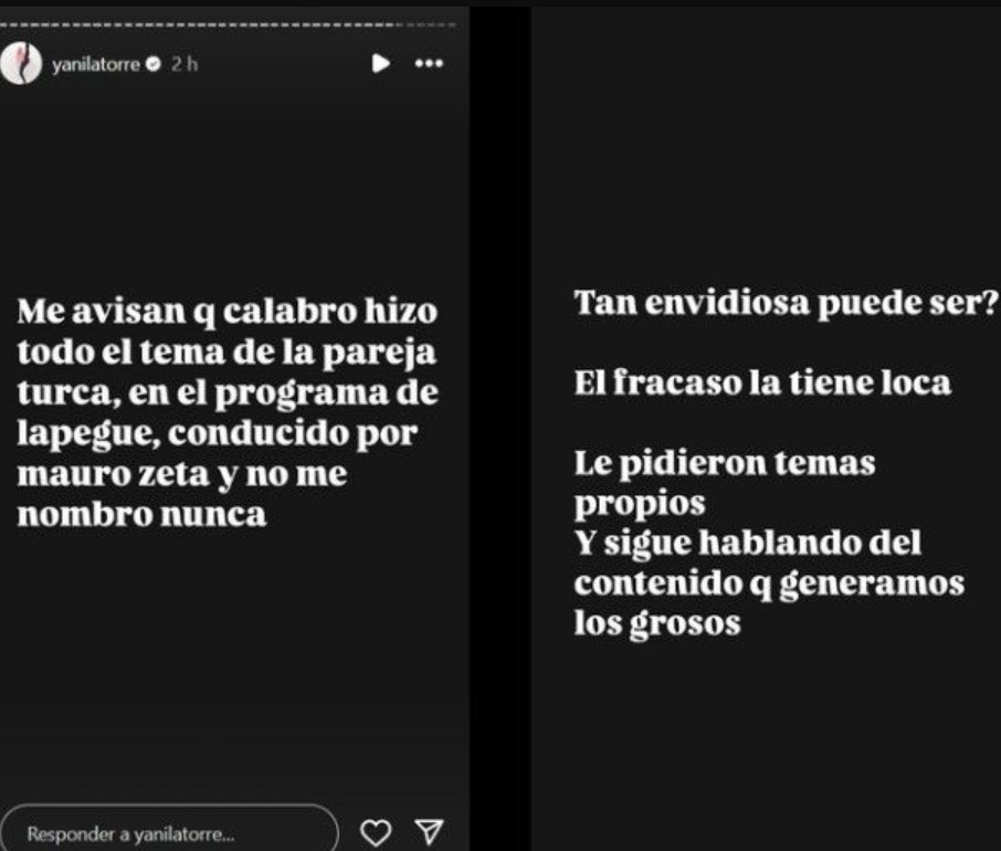 «Me avisan que Calabró hizo todo el tema de la pareja turca en el programa de Lapegüe, conducido por Mauro Seta, y no me nombró nunca» ¿Tan envidiosa puede ser? El fracaso la tiene loca«, comentó Yanina.