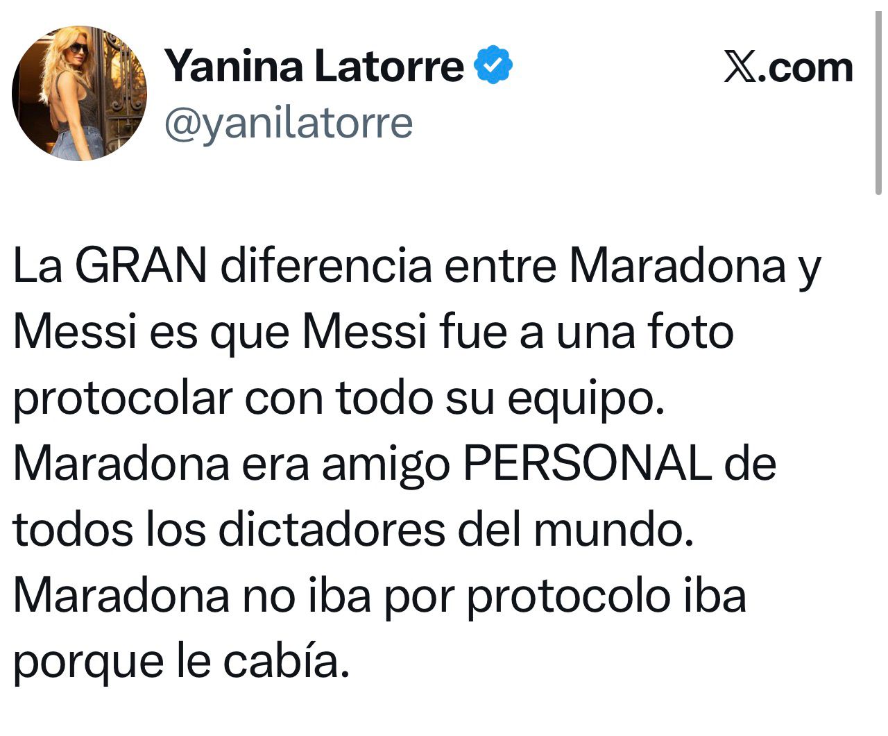 A partir de ese contenido, Latorre escribió en sus redes: “La GRAN diferencia entre Maradona y Messi es que Messi fue a una foto protocolar con todo su equipo. Maradona era amigo PERSONAL de todos los dictadores del mundo. Maradona no iba por protocolo iba porque le cabía.” El comentario generó una fuerte repercusión entre usuarios, que cuestionaron la veracidad de la información original y la comparación entre los dos ídolos del fútbol argentino. Minutos después, Latorre terminó eliminando la publicación.