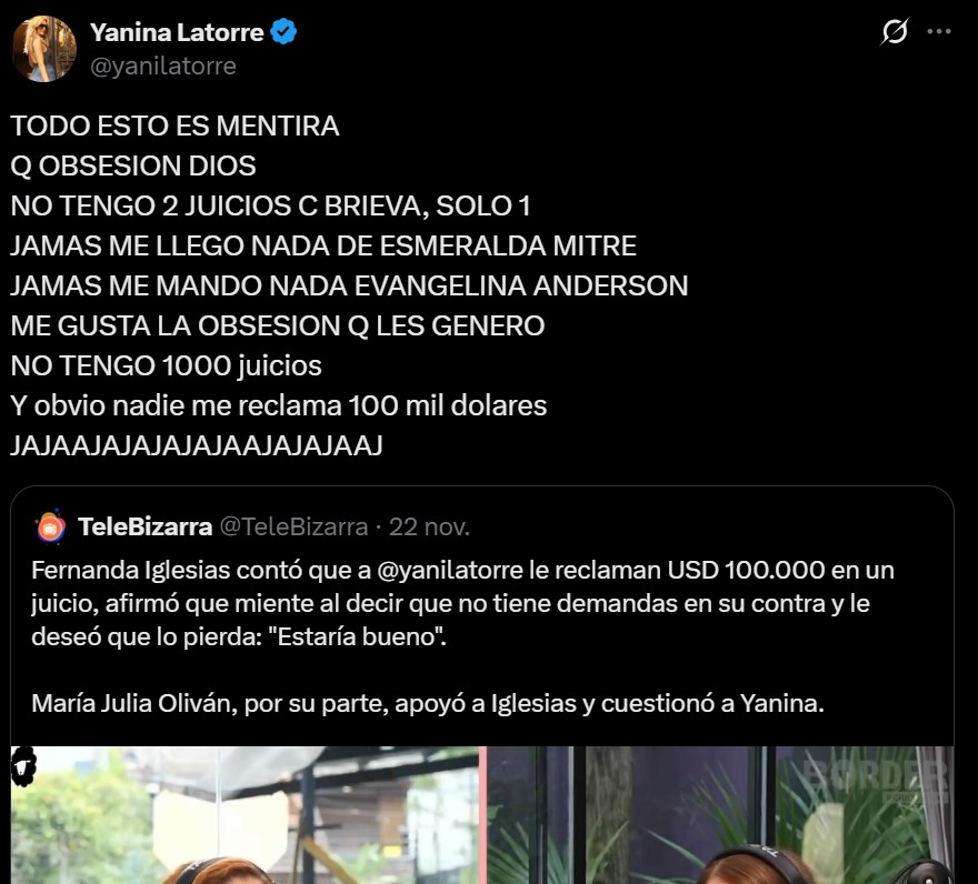 «Jamás me llegó nada de Esmeralda Mitre. Jamás me mandó nada Evangelina Anderson. Me gusta la obsesión que les genero. No tengo 1.000 juicios y obvio nadie me reclama 100 mil dólares jajajajajaja», cerró la panelista.