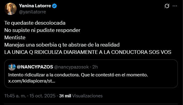La disputa se trasladó a X (ex Twitter), donde Nancy Pazos compartió un fragmento del video con el comentario: «Intento ridiculizar a la conductora. Que le contestó en el momento.» Esto provocó la respuesta inmediata de Yanina Latorre, quien no dudó en contestar con contundencia: «Te quedaste descolocada. No supiste ni pudiste responder. Mentiste. Manejas una soberbia que te abstrae de la realidad. LA ÚNICA QUE RIDICULIZA DIARIAMENTE A LA CONDUCTORA SOS VOS.»